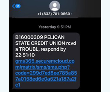 Members have reported receiving a text asking for verification of a transaction. Once they reply "No," they receive a call from a fraudster asking for information. The fraudster then sends a link.