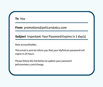 | Pelican will NEVER call, email, or contact you to ask for your username, password, or other online banking credentials. | Pelican will NEVER contact you to ask for your credit or debit card number, PIN, or 3-digit security code. |