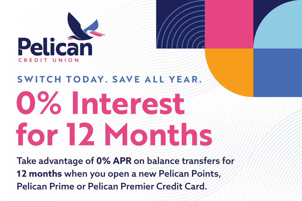 *Balance Transfers: Pelican Credit Union membership and a Points, Premier, or Prime credit card are required. If you are not currently a Pelican member, you must be eligible to open a Primary Share account to become one. The minimum deposit to open a Primary Share account is $15 ($10 membership fee plus a $5 minimum balance). All credit is subject to approval based on creditworthiness. Not all applicants will qualify. APR = Annual Percentage Rate. Balance transfers may not exceed your approved credit limit. Promotional APRs do not apply to purchases or cash advances. There is no grace period for balance transfers. Finance charges will begin accruing on the date each balance transfer posts to your account. Finance charges are calculated using the Average Daily Balance Method, as described in your Cardholder Agreement. A promotional rate of 0% APR may be available for qualifying accounts only. The promotional rate expires 12 months from the posting date of the first qualifying balance transfer. To qualify for the promotional rate, balance transfers must post to the account by December 31, 2026. Any remaining balance after the promotional period will be subject to the regular balance transfer APR. Rates are subject to change. Balance transfers may not be used to pay any loan, line of credit, or credit card account maintained by Pelican Credit Union. Balance transfers do not earn reward points. Verification may be required. There is no minimum balance requirement for balance transfers themselves. Pelican Credit Union reserves the right to decline any balance transfer request, including duplicate requests. A balance transfer fee of $5 or 3.5% of the amount of each balance transferred, whichever is greater, will apply unless otherwise disclosed in a specific promotional offer.