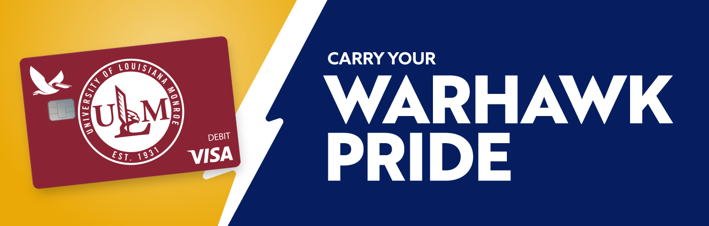 We are thrilled to partner with University of Louisiana at Monroe (ULM) Alumni Association to offer an exclusive school pride debit card that allows you to show your school pride! Each time you swipe your card, you'll be donating money back to the ULM Alumni Association!¹
